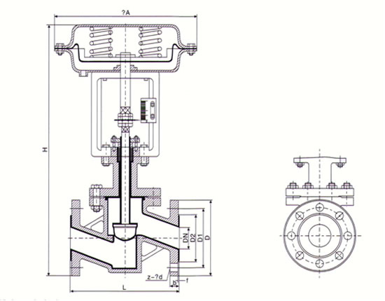 执行机构是气动调节阀生产过程自动控制系统的重要组成部分,其有正反两种作用形式,当信号压力增加,推杆伸出膜室的叫正作用,与阀配合构成气关式(如图2a)。当信号压力增加,推杆推出膜室的叫反作用,与阀配合构成气开式(如图2b)。其原理:当信号压力输入膜室后,在膜片上产生推力,压缩弹簧,使推杆移动,带动阀杆,改变阀芯与阀座之间的流通面积,知道弹簧的反作用与信号压力作用在膜片上的推力想平衡,从而达到自动调节工艺参数之目的。