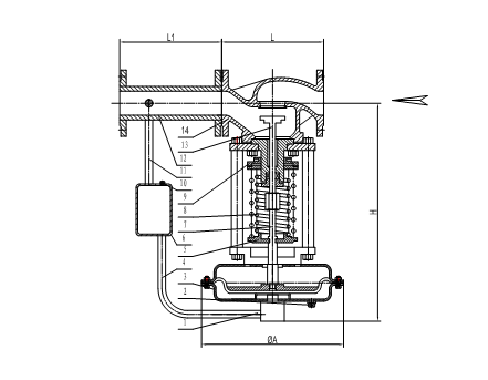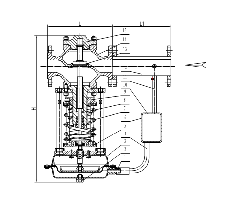 图一b、用于控制阀前压力的调节阀,阀的作用方式为压开型。其原理如下:介质由箭头方向流入阀体,另一条经冷凝器(介质为蒸汽时使用)冷却后,被引入执行机构作用于膜片上,使阀芯随之发生相应的位移,达到泄压、稳压之目的。如阀前压力增加,作用于膜片上的力增加,压缩弹簧,带动阀芯,使阀门开启度增大,直到阀前压力下降到设定值为止。同理,如阀前压力降低,作用于膜片上的力减少,由于弹簧的反作用力,带动阀芯,使阀门开启度减小,直到阀前压力上升到设定值为止。