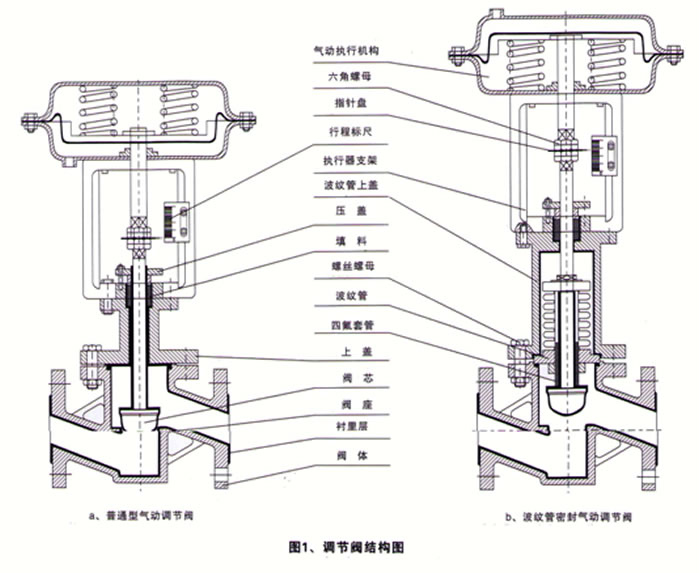 调节阀是由气动薄膜执行机构与调节机构二部分组成,其结构与原理见下图